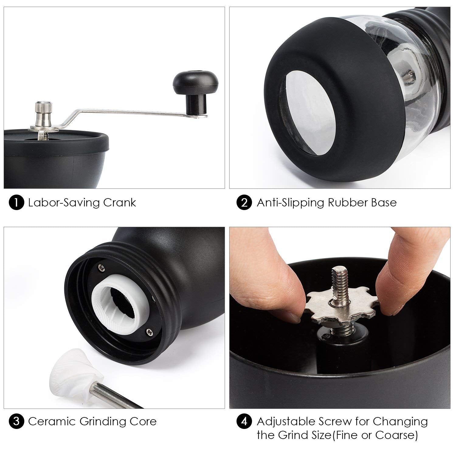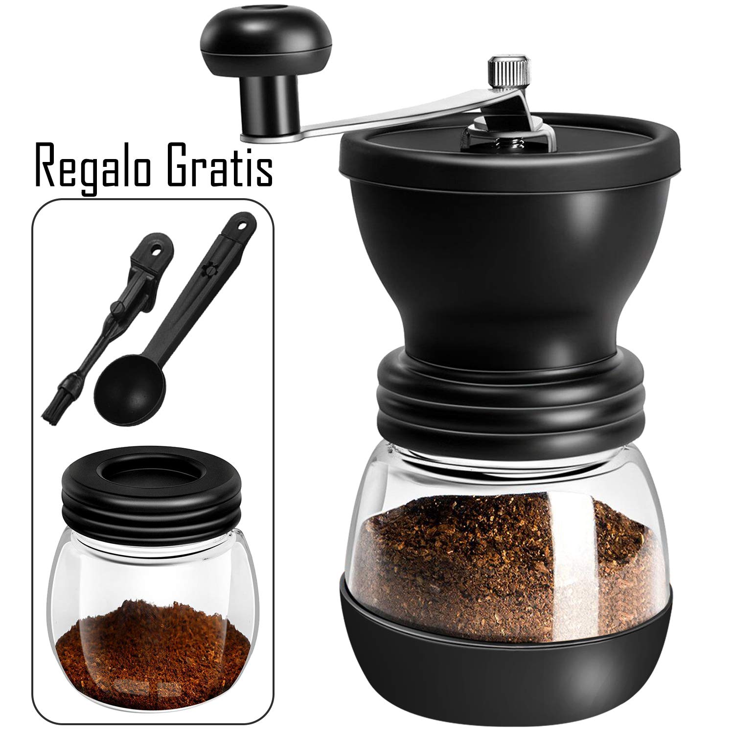 Manual Molinillo de Café - Manivela de Mano Molinillo con Ajustable Cerámica Burr de Carburo/Dos Tarros de Vidrio Transparente/Mango de Acero Inoxidable y Cubierta de Silicona - Portátil para Viajes Camping Trabajo Oficina | Incluye Cuchara de Medición