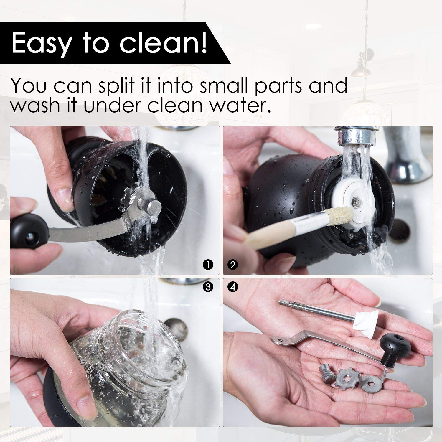 Manivela manual, fondo antideslizante con mecanismo cerámico ajustable. El contenedor de acrílico es reutilizable y apto para lavavajillas. Un tamaño compacto que ahorra espacio para un fácil almacenamiento. Apto para lavavajillas.